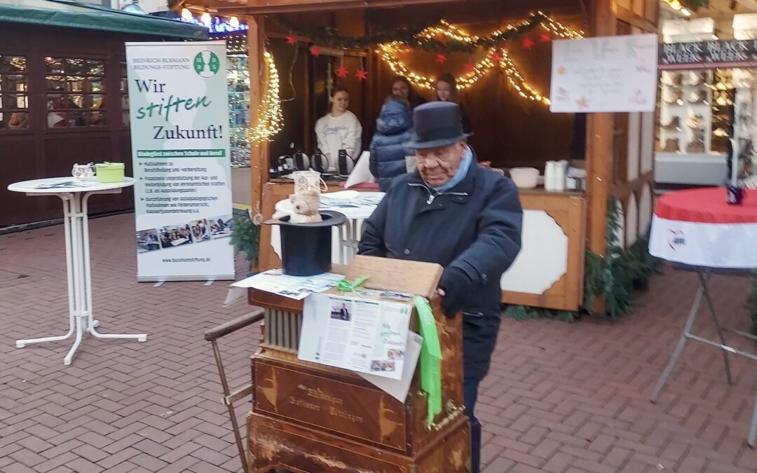 In einer weihnachtlich stimmungsvoll beleuchteten Bude backten Schülerinnen und Schüler der Abschlussklasse der Ludwig-Uhland-Schule fleißig Waffeln und schenkten alkoholfreie Getränke aus, die von Kuratoriumsmitglied Jürgen Gefromm und seiner Firma kostenlos zur Verfügung gestellt wurden. Jürgen Ortlepp, ehemaliger Schulleiter der Heinrich-Bußmann-Schule und langjähriges Kuratoriumsmitglied der HBBS, stellte sich mit seiner Drehorgel ebenfalls in den Dienst der Stiftung und „orgelte“ Passanten an den Stand. Dort nahmen zahlreiche Interessierte und Neugierige bei schmackhaftem Waffelgenuss gerne die Gelegenheit wahr, mit Vorstands- und Kuratoriumsmitgliedern der HBBS ins Gespräch zu kommen. Die Inhalte der Gespräche bezogen sich auf die Stiftungsidee, deren Umsetzung in zahlreichen, von der Stiftung geförderten Bildungsprojekten bis hin zu den Möglichkeiten, die Stiftung in Form von Spenden oder Zustiftungen zu unterstützen. Finanzielle Zuwendungen sind für die Arbeit der Stiftung enorm wichtig, damit sie auch in Zukunft finanziell flexibel bleibt und damit dringende und nachhaltige Bildungsprojekte puschen oder auch überhaupt ins Leben rufen kann. Die Resonanz bei den Passanten war durchweg positiv.